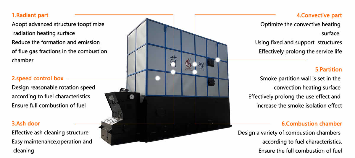 YLW series thermal oil boiler is a square coil horizontal chain grate assembled boiler, and the chain grate and boiler body are shipped separately from the factory, The boiler adopts chain grate to realize mechanical coal feeding equipped with drum and induced draft fan for mechanical ventilation. It is also equipped with slag extractor to realize mechanical slag extraction.During operation, the fuel falls from the stoker to the grate for combustion, and the high-temperature flue gas is reflected to the front of the furnace through the rear arch and enters the furnace. The boiler then enters the air preheater, and finally enters the dust collector. After dust removal, the flue gas is drawn by the induced draft fan and discharged to the air through the chimney.
